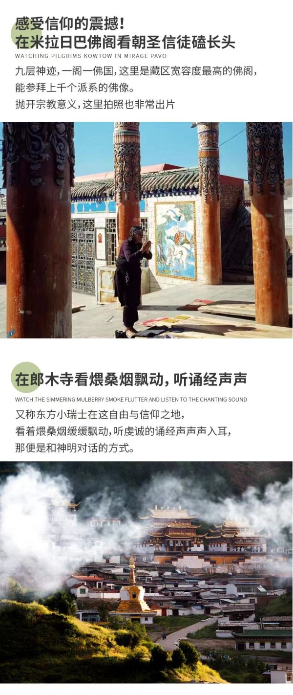 而后前往米拉日巴佛閣。甘南擁有最密集、最豐富的藏傳佛教寺廟,【米拉日巴佛閣】便是其中最著名的代表作,被稱為“九層神跡”。米拉日巴佛閣是藏傳佛教噶舉派(白教)在安多藏區(qū)的代表寺院,閣內(nèi)主要供奉藏傳佛教史上最富傳奇色彩、婦孺皆知的米拉日巴尊者,他同時(shí)也是噶舉派創(chuàng)教者之一。米拉日巴佛閣樓高共九層,有以金剛為主的四密乘的眾多佛像、菩薩、護(hù)法神等各類佛像1720尊,還有規(guī)模巨大的反映藏傳佛教內(nèi)容的各類壁畫,繪畫技法高超,具有很高的藝術(shù)價(jià)值。在這里聽(tīng)聽(tīng)米拉日巴尊者的傳奇故事,了解藏傳佛教各個(gè)教派的歷史,在僧人呢喃佛音中感受那份信仰的虔誠(chéng)。