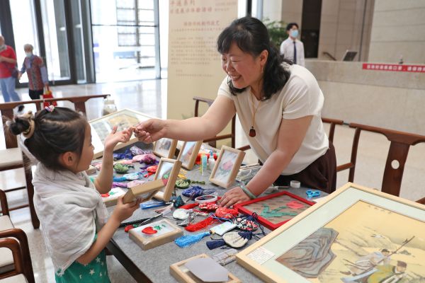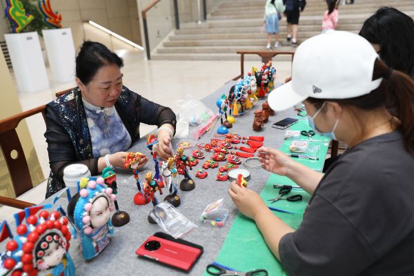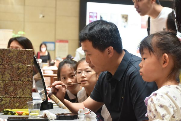 在平遙推光漆器髹飾技藝體驗(yàn)區(qū),活潑可愛(ài)的貓咪、亭亭玉立的荷花,活靈活現(xiàn)地展現(xiàn)在漆器上。在平遙木雕神像傳統(tǒng)技藝體驗(yàn)區(qū),孩子們細(xì)細(xì)雕刻著手中的作品,沉浸在創(chuàng)作的樂(lè)趣中。在晉中面塑技藝體驗(yàn)區(qū),不少觀眾親手制作出惟妙惟肖的專(zhuān)屬面塑人物。在平遙傳統(tǒng)(白)銅器制作技藝體驗(yàn)區(qū),在陣陣“叮叮當(dāng)當(dāng)”的金屬敲擊聲中,一件件亮閃閃的生肖掛件制作完成。在堆繡傳統(tǒng)制作技藝體驗(yàn)區(qū),精美細(xì)膩的堆繡也吸引了不少人圍觀,大家紛紛向傳承人詢問(wèn)剪裁和針?lè)ǖ姆椒记伞?