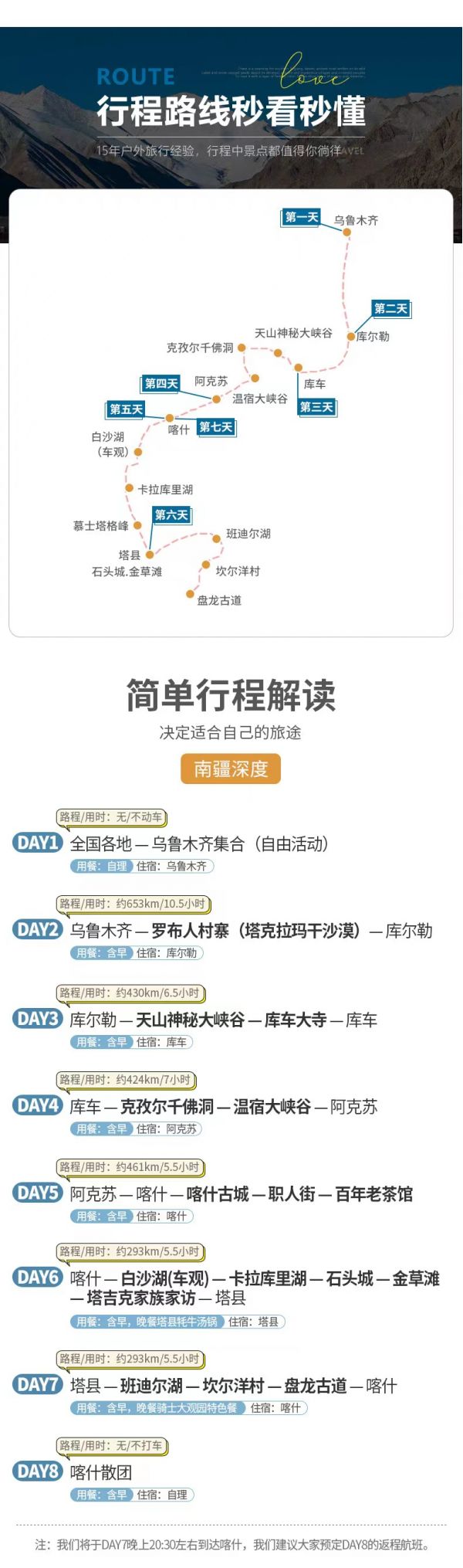 當天車程較長,從北疆穿越天山甘溝進入南疆腹地,氣候變化較大,請適當增減衣物,注意補充水分??商崆百徺I一些零食,以備不時之需。