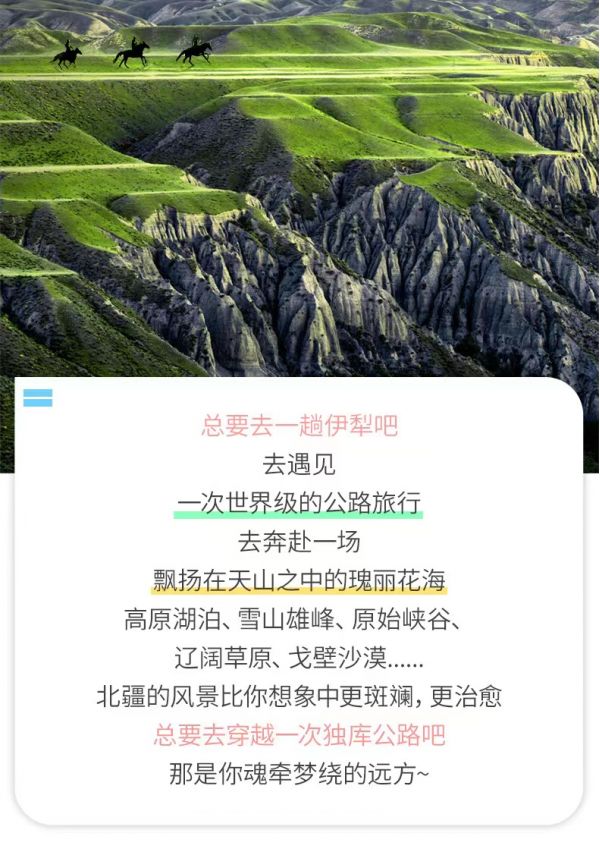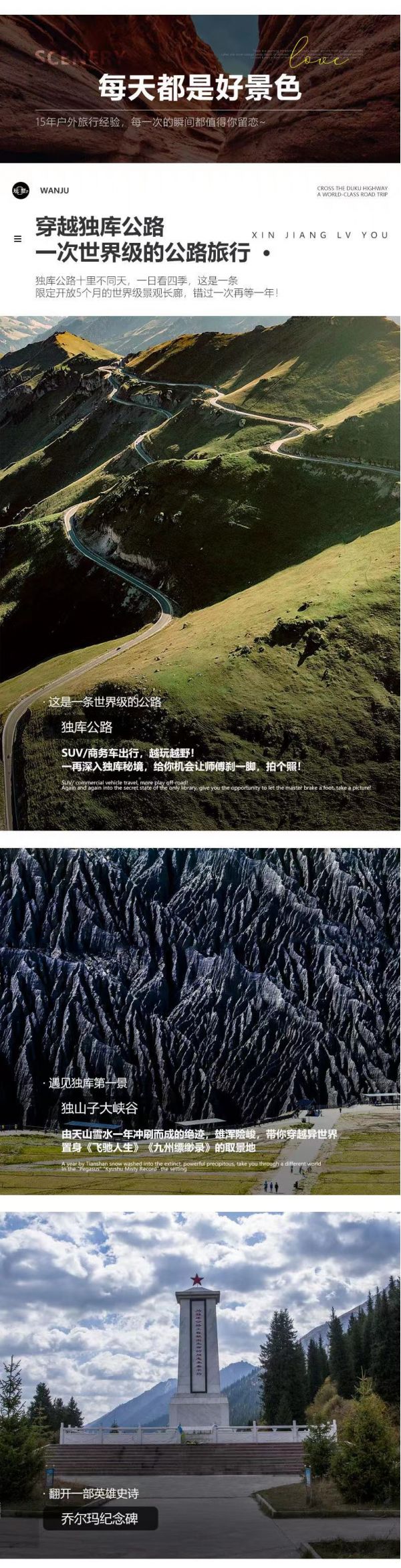 早餐后今日就踏上了傳說中一日能看到四季的【獨庫公路】,獨庫公路宛如一條巨龍盤臥天山。這條全長561公里、連接南北疆的公路,橫亙崇山峻嶺、穿越深山峽谷,貫通了南北疆,堪稱是中國公路建設(shè)史上的一座豐碑。沿途風景只能用神奇來形容,途可欣賞神秘險峻的峽谷風景,天山腹地茂密的植被和游牧風情及浩瀚的草原景色。經(jīng)喬爾瑪前往唐布拉,游覽【唐布拉百里畫廊】她是原生態(tài)的,是純粹的,也是純凈的。在眾美之中,有這樣一處還未被開發(fā),深藏閨中的風景,宛如私藏的秘境,當你撩開它的面紗,你會慢慢沉醉其間,為之傾倒,最后迷戀上它?!締虪柆敻锩沂苛陥@】,喬爾瑪革命烈士陵園位于天山深處217國道旁的新疆伊犁州尼勒克縣喬爾瑪。是為了紀念為了修建天山獨庫公路而犧牲并安葬在這里的168名革命烈士而建的國家革命烈士陵園。