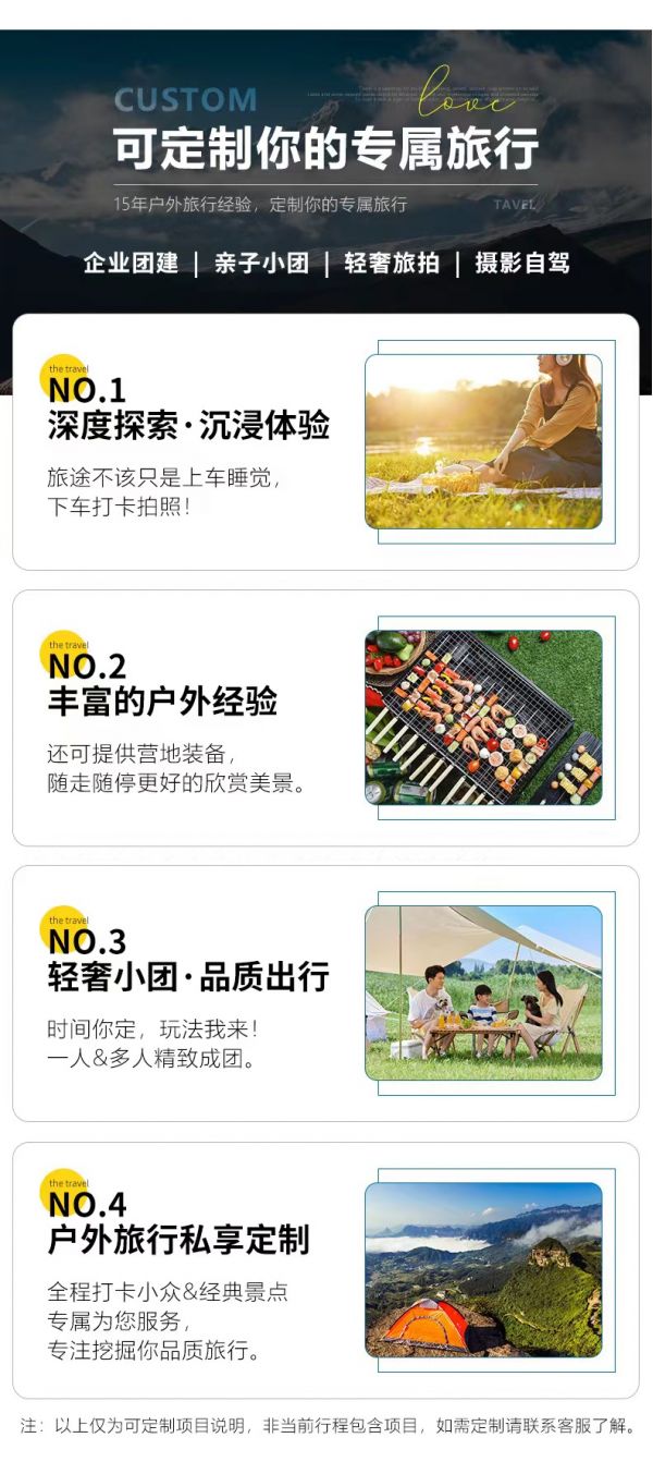 私人訂制:我們業(yè)務范圍囊括了全國各大城市,川西、西北、新疆、西藏,在路上永遠有我們的身影。我們將為每一個有定制需求的你策劃出獨屬于自己的完美旅行。