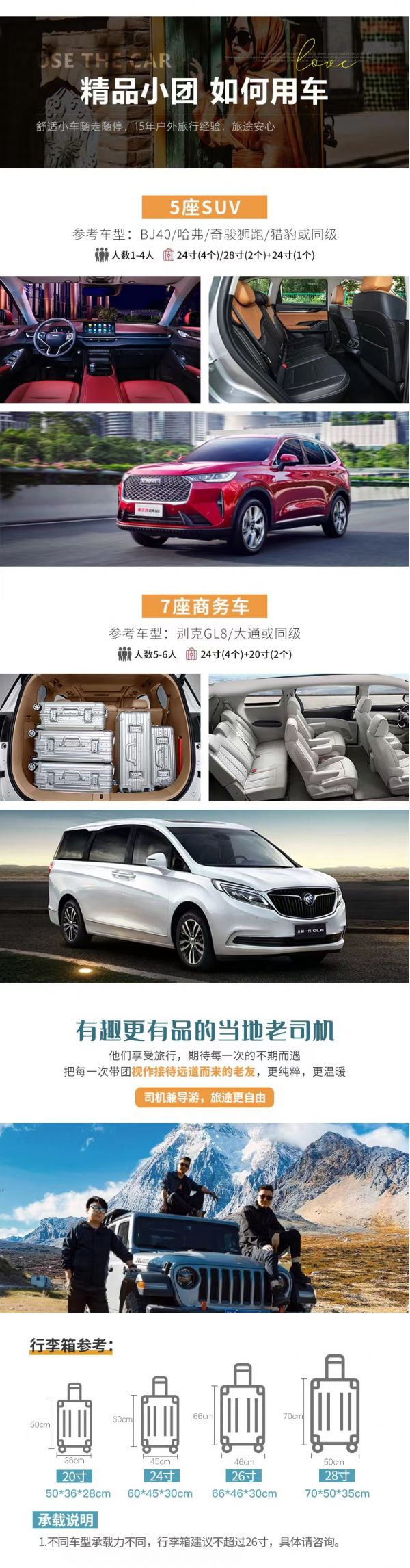 交通:2-6人VIP私享小團全程suv/舒適商務車出行;車型大小根據(jù)實際人數(shù)安排,且由駕駛經(jīng)驗豐富的司機為您的出行保駕護航,報價包含車費、油費、停車費、維修費及司機勞務費。