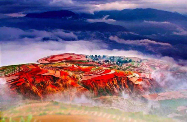 云貴高原上有一片絢爛的土地,赤、橙、紅、綠、青、藍(lán)、紫,像彩虹一般,那似乎是被遠(yuǎn)古天地塌陷后燃起的天火狠狠地燃燒過,才有了如今這般艷麗到極致的色彩。入秋之后,則艷之更甚,燦之愈烈!