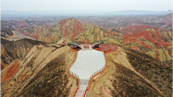 沿著棧道蜿蜒向上,隨著視角逐漸抬高眼前的水墨丹霞景區(qū)美景,絲路霞光、九色丹青、丹頂攬勝,更遠(yuǎn)方景區(qū)的天際線盡收眼底。