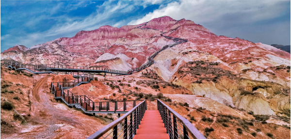 “雄鷹探海,雙翼齊飛”絲路雄鷹觀景平臺(tái)海拔1841米,是景區(qū)內(nèi)第一個(gè)近距離俯瞰丹霞地貌的觀景點(diǎn)。此處丹霞崖壁壯觀雄渾,紅山灣地貌色彩斑斕,猶如跌落人間的彩虹。既可俯瞰全貌,又可深入彩色山嵐,近觀微型石林之妙,遠(yuǎn)賞南北兩側(cè)地質(zhì)差異奇觀,是游客近距離接觸丹霞地質(zhì)遺跡的最佳地點(diǎn)。