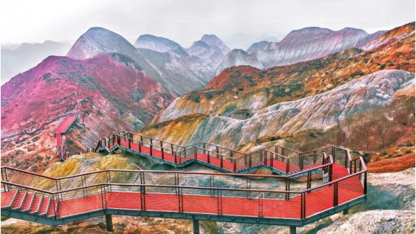 翠峰瀾天觀景平臺(tái)位于丹霞道中部,其具有觀光、休憩功能,此處為丹霞地貌的一個(gè)分水嶺,可以看到兩種不同的場(chǎng)景,左側(cè)山頭翠綠的碧色與右側(cè)彩色的山丘形成鮮明的對(duì)比。