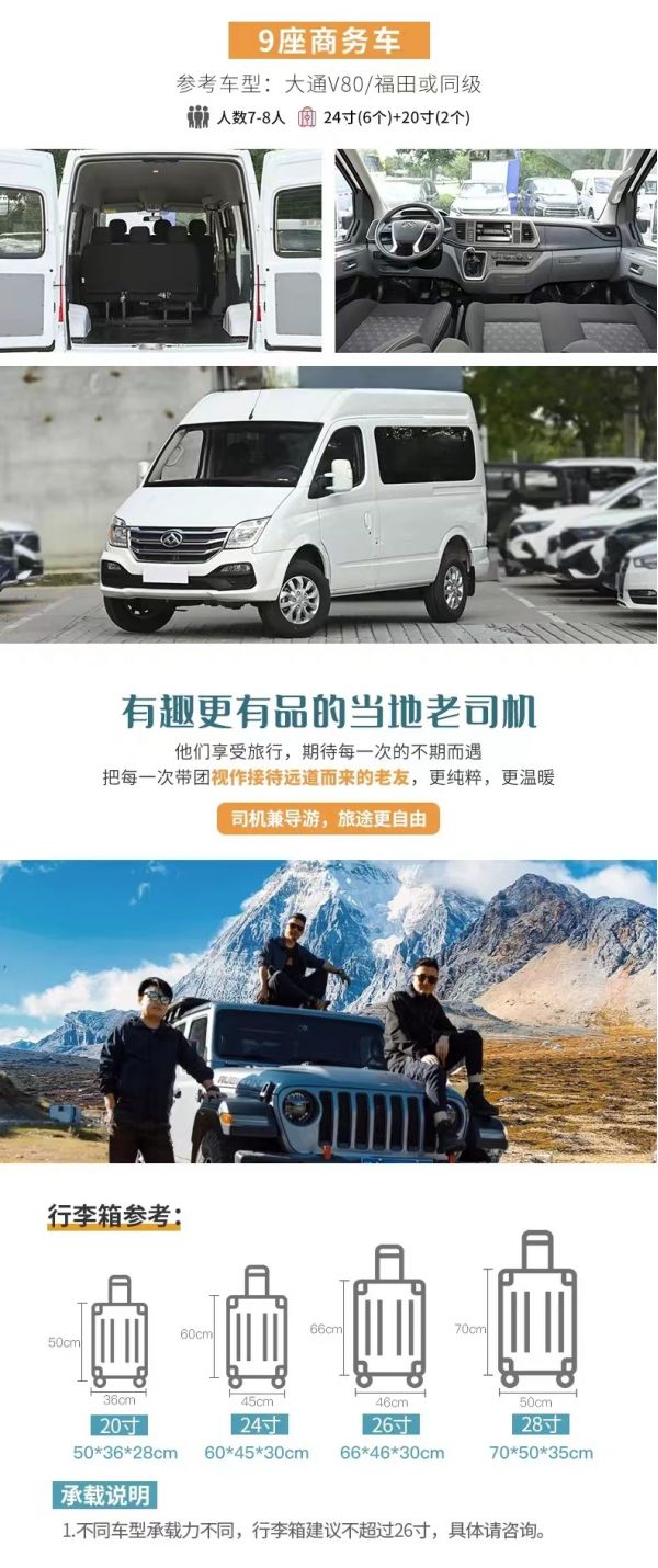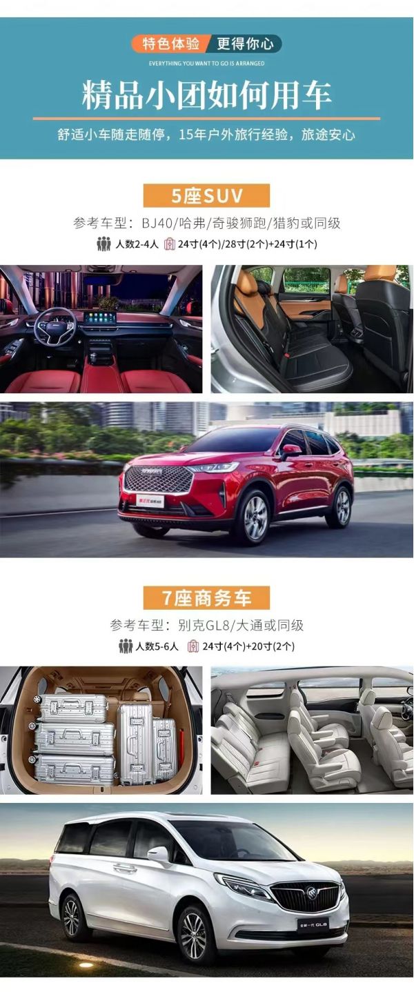 交通:2-8人VIP私享小團(tuán),全程舒適商務(wù)車(chē)出行,車(chē)型大小根據(jù)實(shí)際人數(shù)安排,保證一人一正座位,且由駕駛經(jīng)驗(yàn)豐富的司機(jī)為您的出行保駕護(hù)航,報(bào)價(jià)包含車(chē)費(fèi)、油費(fèi)、停車(chē)費(fèi)、維修費(fèi)及司機(jī)勞務(wù)費(fèi);