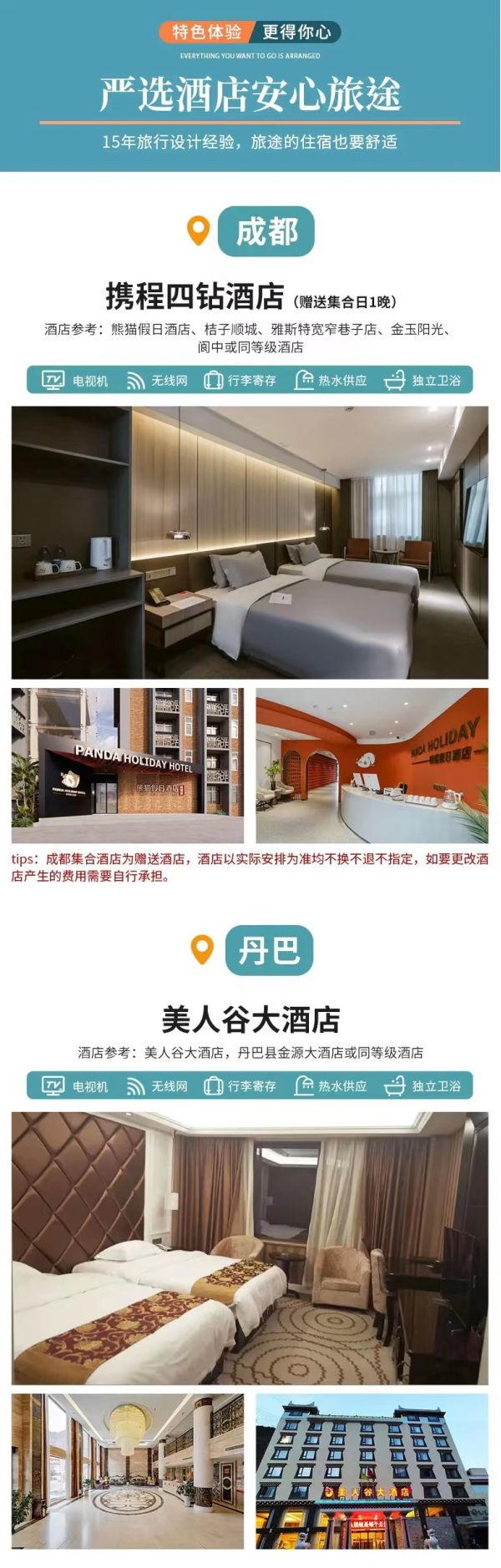 tips:成都集合酒店為贈(zèng)送酒店,酒店以實(shí)際安排為準(zhǔn)均不換不退不指定,如要更改酒店產(chǎn)生的費(fèi)用需要自行承擔(dān)。