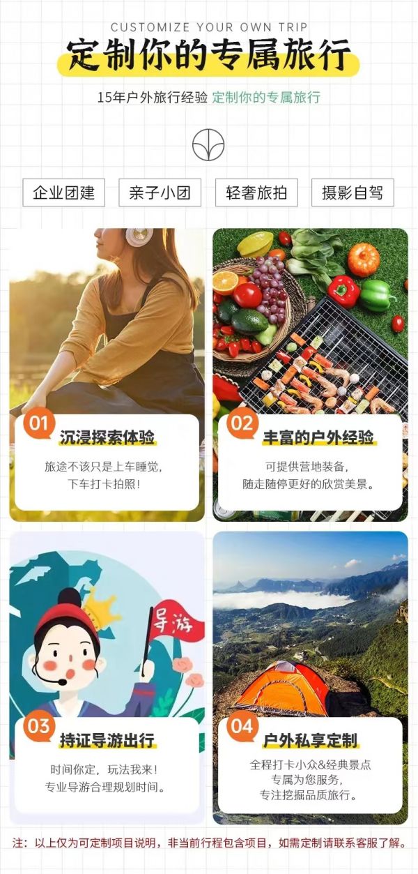 私人訂制:我們業(yè)務(wù)范圍囊括了全國各大城市,川西、西北、新疆,在路上永遠有我們的身影。我們將為每一個有定制需求的你策劃出獨屬于自己的完美旅行。