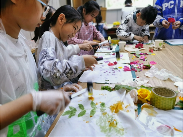 扎染和拓染是我國民間特有的印染技術(shù),是非物質(zhì)文化遺產(chǎn),其工藝從扎到染、從拓到染都具有豐富的創(chuàng)造性。首先,老師以故事的形式講解了扎染的由來及制作過程,同學(xué)們都躍躍欲試。但是在扎繩子的時(shí)候同學(xué)們卻犯了難,不知道怎么樣扎出自己想要的圖案。通過老師講解、示范,同學(xué)們有了思路,經(jīng)過自己的探索,扎出了各種形狀,涂染上不同的顏料;拓染活動又引爆了同學(xué)們的興奮點(diǎn),同學(xué)們揮動著錘頭,敲打著早已經(jīng)準(zhǔn)備好的花草,期待著完成后的驚喜。