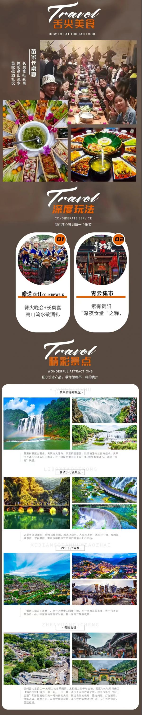 “觀西江而知天下苗寨”,這里是世界上最大的苗寨,也是苗族最后的烏托邦?!?strong>西江千戶苗寨】由5個依山而建的自然村寨相連而成,高差近百米的峽谷內(nèi),鱗次櫛比的分布著數(shù)千座吊腳樓。一條白水河將村子一分為二,宛若為西江纏上了一圈腰帶,瞬間有了靈氣,白水河上,八座風(fēng)雨橋依次排列,婀娜多姿的苗家姑娘,就倚靠在橋上的美人靠里,展現(xiàn)出曼妙的身姿,白水河邊,隨處可見的苗族歌舞,服飾,為這里添加了一筆民族風(fēng)情,跟街邊的阿公阿婆學(xué)上幾句苗語。苗語“咪公”就是打招呼,“呀啦米”就是我愛你。