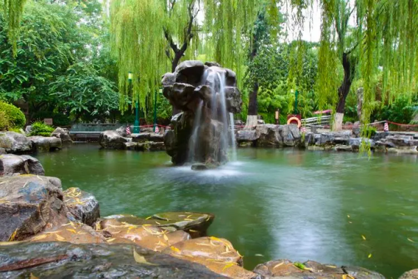 濟(jì)南市五龍?zhí)豆珗@東南隅,看到月牙泉泉水由泉池中央蘑菇云狀的疊石三面齊涌而出,似飛瀑、若水簾,甚為壯觀。