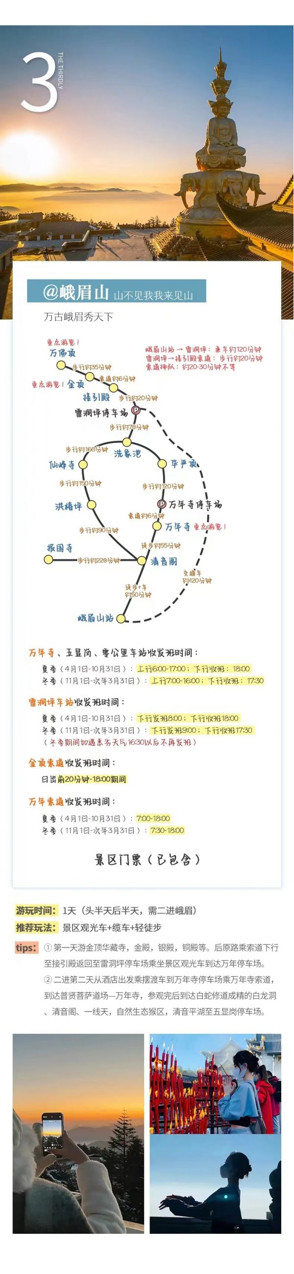 【金頂】,游金頂華藏寺,金殿,銀殿,銅殿,大型觀景臺(tái)等,觀世界最高佛教朝拜中心,登攝身崖,俯視川西平原的優(yōu)美風(fēng)光,充分感受峨眉“雄,秀,奇,險(xiǎn),幽”的五大特色。然后原路乘索道下行至接引殿返回至雷洞坪停車場乘坐景區(qū)觀光車到達(dá)萬年停車場。