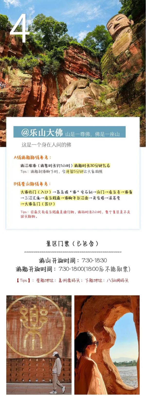 用午餐,品嘗世界非物質(zhì)文化遺產(chǎn)-翹腳牛肉或峨眉地道九大碗(根據(jù)實(shí)際情況2選1安排),步行約15分鐘至迎春橋,乘坐旅游車來到樂山。深度登山游覽樂山大佛景區(qū)(參觀約3小時(shí))步行333個(gè)臺(tái)階到達(dá)山頂,觀賞世界第一大彌勒坐佛-樂山大佛、凌云寺、九曲摘道、大雄寶殿、靈寶塔,在瞻仰樂山大佛宏偉氣勢的同時(shí),體驗(yàn)”蜀道難、難于上青天的感覺”,抱千年佛腳后,游漫山的石刻佛像、凌云寺、靈寶塔從東門下山返回到停車場。也可以選擇樂山大佛游船活動(dòng)哦~看樂山大佛湖面全景。
