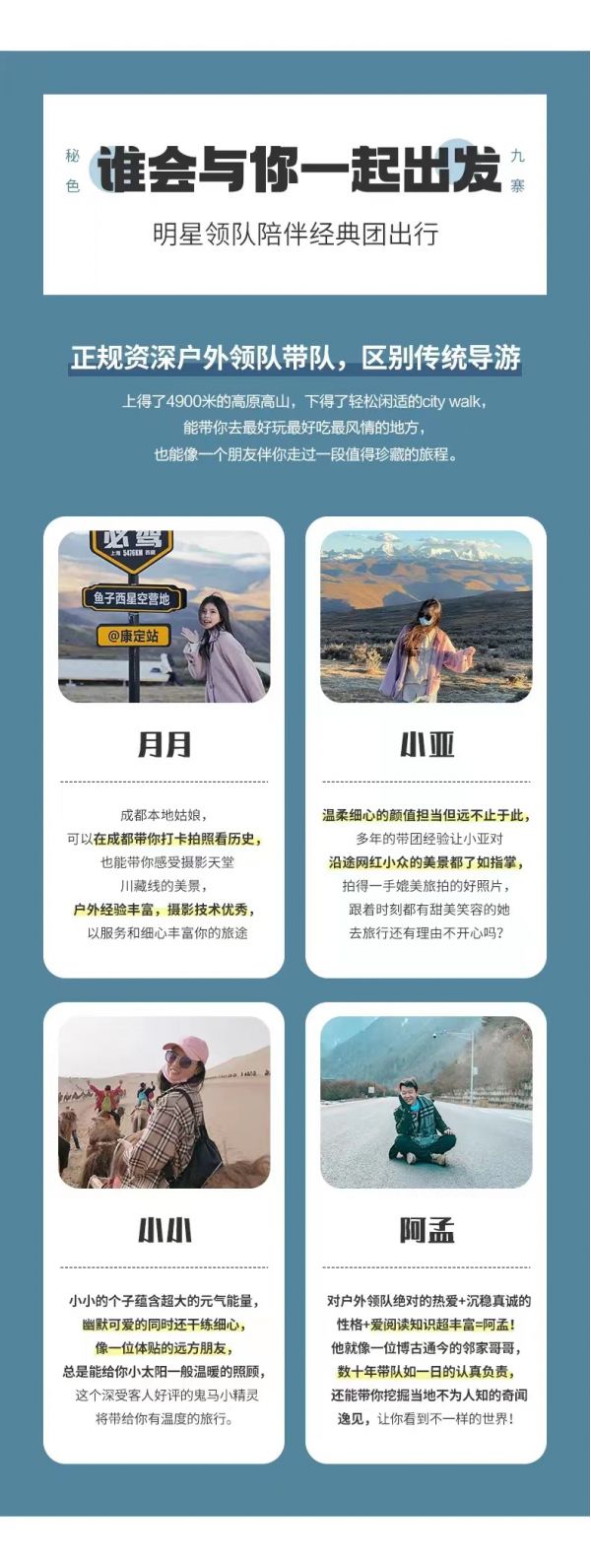 (5)走進(jìn)藏家藏文化體驗(yàn)由領(lǐng)隊(duì)/司機(jī)視實(shí)際情況靈活安排在D2或D3;如因九寨溝防疫政策規(guī)定,走進(jìn)藏家暫停營業(yè),則晚餐調(diào)整為團(tuán)餐,望您諒解。