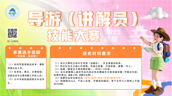 為深入貫徹落實省委、省政府《關于促進文旅深度融合推動旅游業(yè)高質(zhì)量發(fā)展的意見》,圍繞“文旅興市”目標任務,塑強聊城“兩河之約”文旅品牌,提升“江北水城·兩河明珠”城市品牌影響力和吸引力,助力建設青年友好型城市。聊城市啟動“兩河之約·最聊城”2023聊城文化旅游大使選拔暨導游(講解員)職業(yè)技能大賽,2023年12月9日前,均可通過線上報名通道報名參賽。