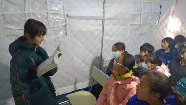 22號(hào)上午在位于甘肅省積石山縣石塬鎮(zhèn)肖紅坪村的一個(gè)臨時(shí)安置點(diǎn),總臺(tái)記者在采訪(fǎng)時(shí)聽(tīng)到了朗朗的讀書(shū)聲,這里搭建起了甘肅震區(qū)首個(gè)帳篷學(xué)校。