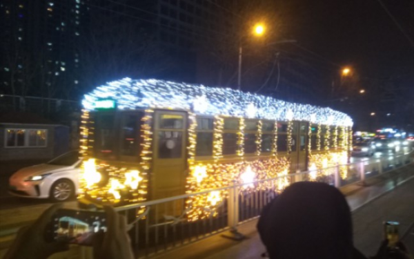 在中國(guó)《節(jié)日序曲》優(yōu)美歡快的旋律中,百年老電車的銅鈴“叮當(dāng)”響起,這輛流光溢彩的“光影電車”正式起程。
