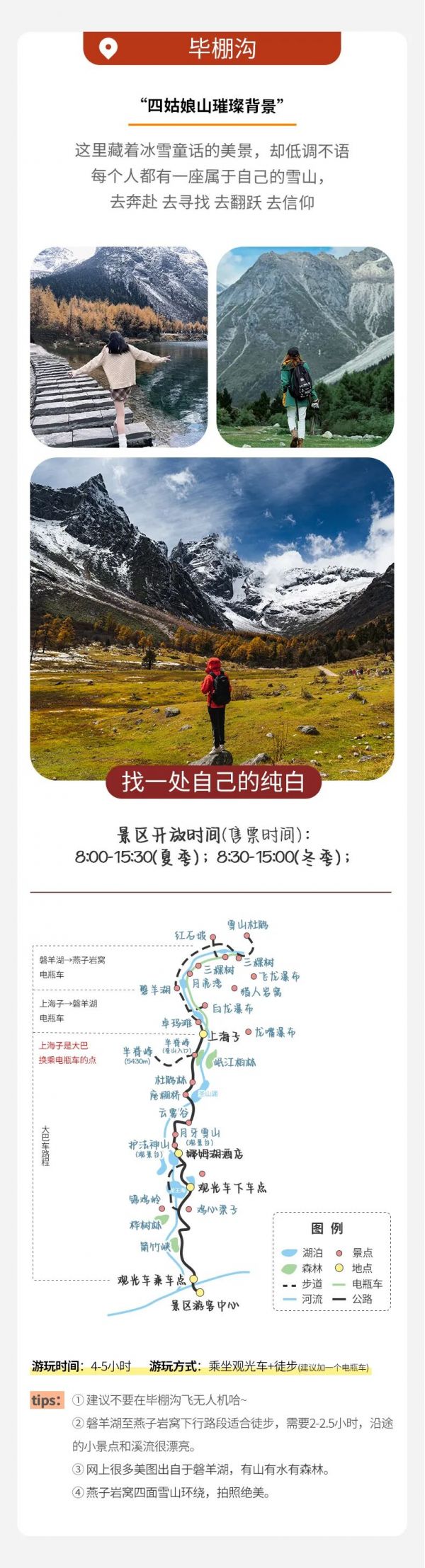 ? 美麗的山水世界【畢棚溝景區(qū)】(游覽時(shí)間3-4小時(shí))換乘景區(qū)觀光車,觀賞古樸的原始風(fēng)光,海龍王潭、女皇峰、娜姆湖、神女十二蜂、盤羊湖,美景讓您流連忘返, 這與大自然最親密的接觸, 留在心里,回味一生!冬季的畢棚溝,銀裝素裹,美不勝收,滑 雪、堆雪人,打雪仗,各種雪上娛樂項(xiàng)目其樂無(wú)窮。仿佛穿行如夢(mèng)如幻的冰雪童話世界,畫下你的身影,將您的祝福永遠(yuǎn)留在這里!穿梭于原始森林,眺綿延崎雪山雄峰、望飛瀉而下 的瀑布、看星羅棋布的海子、覓時(shí)有出沒的山珍野獸,夢(mèng)幻般的世界讓你領(lǐng)略別樣的異族風(fēng)情。