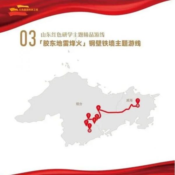 1. 煙臺市地雷戰(zhàn)旅游景區(qū)——2.煙臺市海陽地雷戰(zhàn)紀念館——3.煙臺市八路軍膠東軍區(qū)機關舊址——4.威海市馬石山烈士陵園——5.威海市紅色密營(下石硼村)——6.威海市膠東育兒所——7.威海市文登天福山革命遺址