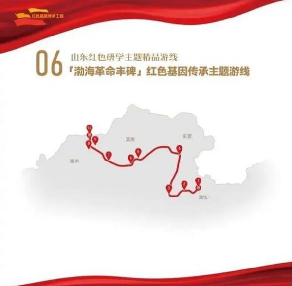 1. 濰坊市大家洼紅色革命研學基地——2.濰坊市壽光牛頭鎮(zhèn)抗日武裝起義陳列館——3.東營市紅色劉集旅游景區(qū)——4.東營市渤海墾區(qū)革命紀念館——5.濱州市渤海革命老區(qū)紀念園——6.濱州市渤海革命老區(qū)機關舊址——7.濱州市渤海革命老區(qū)兵器博物館——8.德州市冀魯邊區(qū)革命紀念園——9.德州市八路軍冀魯邊區(qū)抗戰(zhàn)郵局舊址——10.德州市北海銀行冀魯邊區(qū)分行舊址