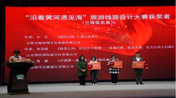 會上,對山東省“沿著黃河遇見?!甭糜尉€路產(chǎn)品設(shè)計大賽獲獎?wù)哂枰宰C書和現(xiàn)金獎勵。