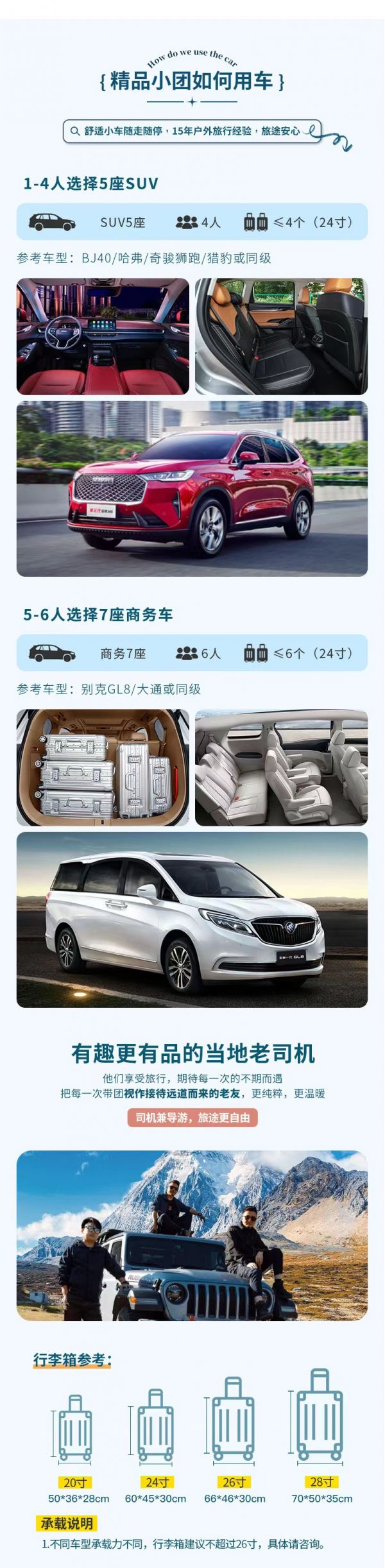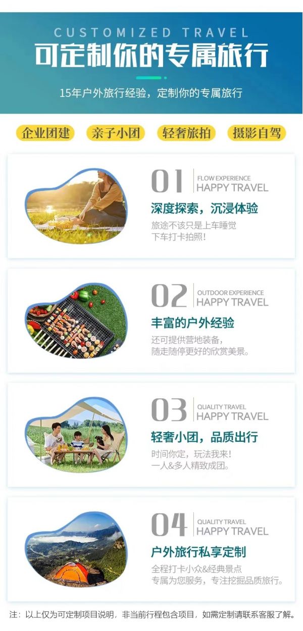 私人訂制:我們業(yè)務(wù)范圍囊括了全國各大城市,川西、西北、西藏、新疆,在路上永遠(yuǎn)有我們的身影。我們將為每一個(gè)有定制需求的你策劃出獨(dú)屬于自己的完美旅行。