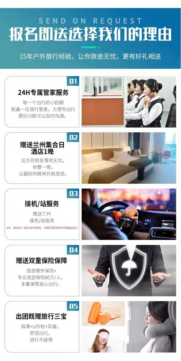 接站服務(wù):2人及以上免費(fèi)提供蘭州市區(qū)拼車接火車服務(wù),接火車的工作人員會(huì)在您出發(fā)日期前一天21:30之前向您推送消息并與您聯(lián)系,如果超過時(shí)間沒有接到任何通知,請及時(shí)與領(lǐng)隊(duì)或報(bào)名處聯(lián)系。(節(jié)假日用車人數(shù)較多情況下客人等待時(shí)間可能會(huì)延長;我方會(huì)安排臨近航班拼車接站,如遇其他客人航班火車延誤晚點(diǎn)情況,等待時(shí)間可能會(huì)延長,敬請諒解)
