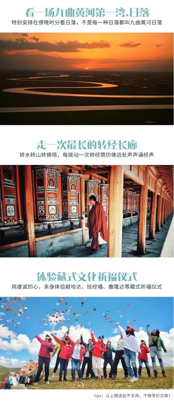 繼續(xù)往前【拉卜楞寺】,有“世界佛學(xué)院”之稱的【拉卜楞寺】。拉卜楞寺是藏傳佛教格魯派六大宗主寺之一 , 規(guī)模僅次于布達(dá)拉宮,是藏傳佛教格魯派最高佛學(xué)學(xué)府之一,被世界譽(yù)為“世界藏學(xué)府”,相當(dāng)于我們眼中的“清華北大”。在漫長的發(fā)展中拉卜楞寺形成了獨(dú)特的藏傳佛教文化,包括建筑、學(xué)院、法會(huì)、佛教藝術(shù)、藏經(jīng)等,曾經(jīng)是甘、青、川毗鄰地區(qū)藏族的政治、宗教、文化中心。在學(xué)院堪布的帶領(lǐng)下來,進(jìn)入寺院,欣賞美麗的壁畫、唐卡,精美佛像;走過朱紅玄黃長廊,和喇嘛一起撥動(dòng)轉(zhuǎn)經(jīng)筒;在這紅白相間的宏偉寺院中,看虔誠的信徒磕著等身長頭來此轉(zhuǎn)經(jīng);與僧人一起聽經(jīng)、打坐,靜靜感受這份信仰的力量。而后經(jīng)過【瑪曲】,母親河黃河這里自西南入境,復(fù)從西北出境。