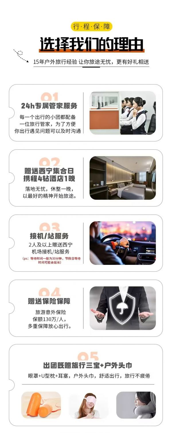 接機/站服務(wù):本次活動提供西寧市內(nèi)24小時接機/接站服務(wù),工作人員會在您出發(fā)日期前一天21:30之前向您推送消息并與您聯(lián)系,如果超過時間沒有接到任何通知,請及時與報名處聯(lián)系。(接站等待時間一般為15-20分鐘,最長不超30分鐘,節(jié)假日拼單人數(shù)較多情況下客人等待時間可能會延長)。