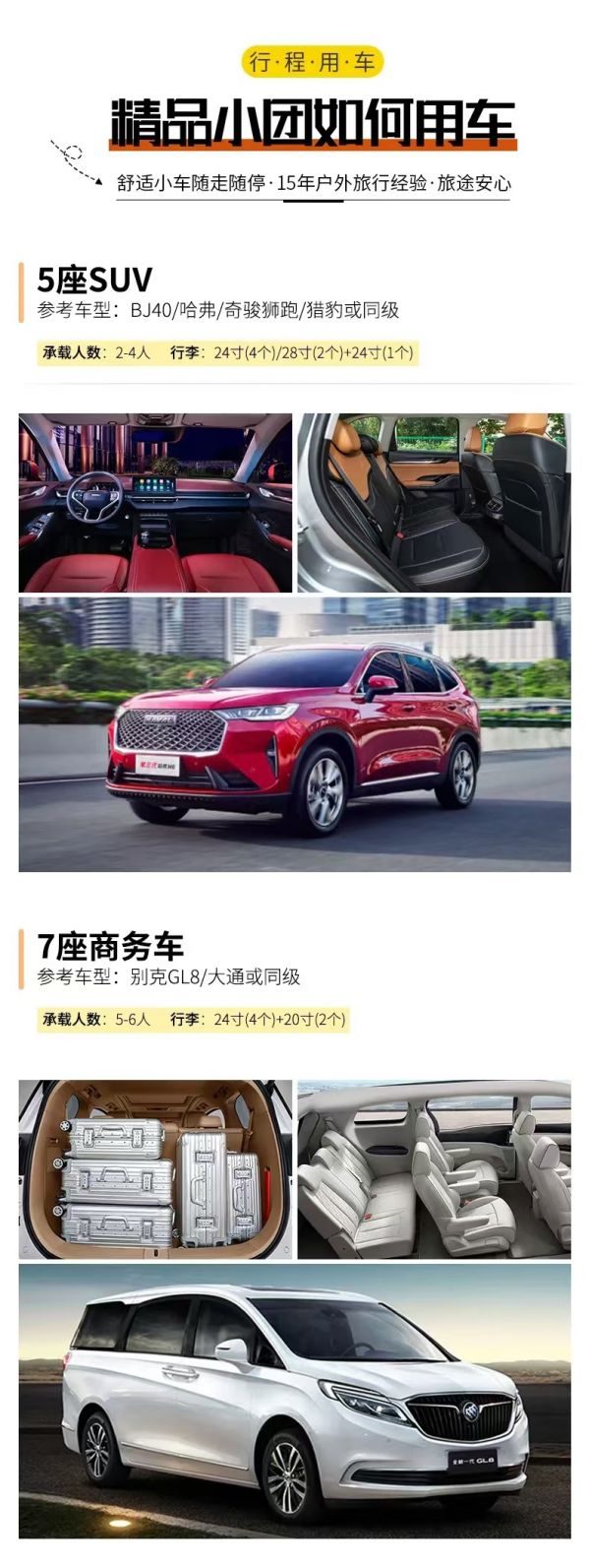 ● 交通:VIP私享2-8人小團(tuán),全程商務(wù)車/越野車出行,保證一人一正座位,車型大小根據(jù)實際人數(shù)安排,且由駕駛經(jīng)驗豐富的司機為您的出行保駕護(hù)航,報價包含車費、油費、停車費、維修費及司機勞務(wù)費。