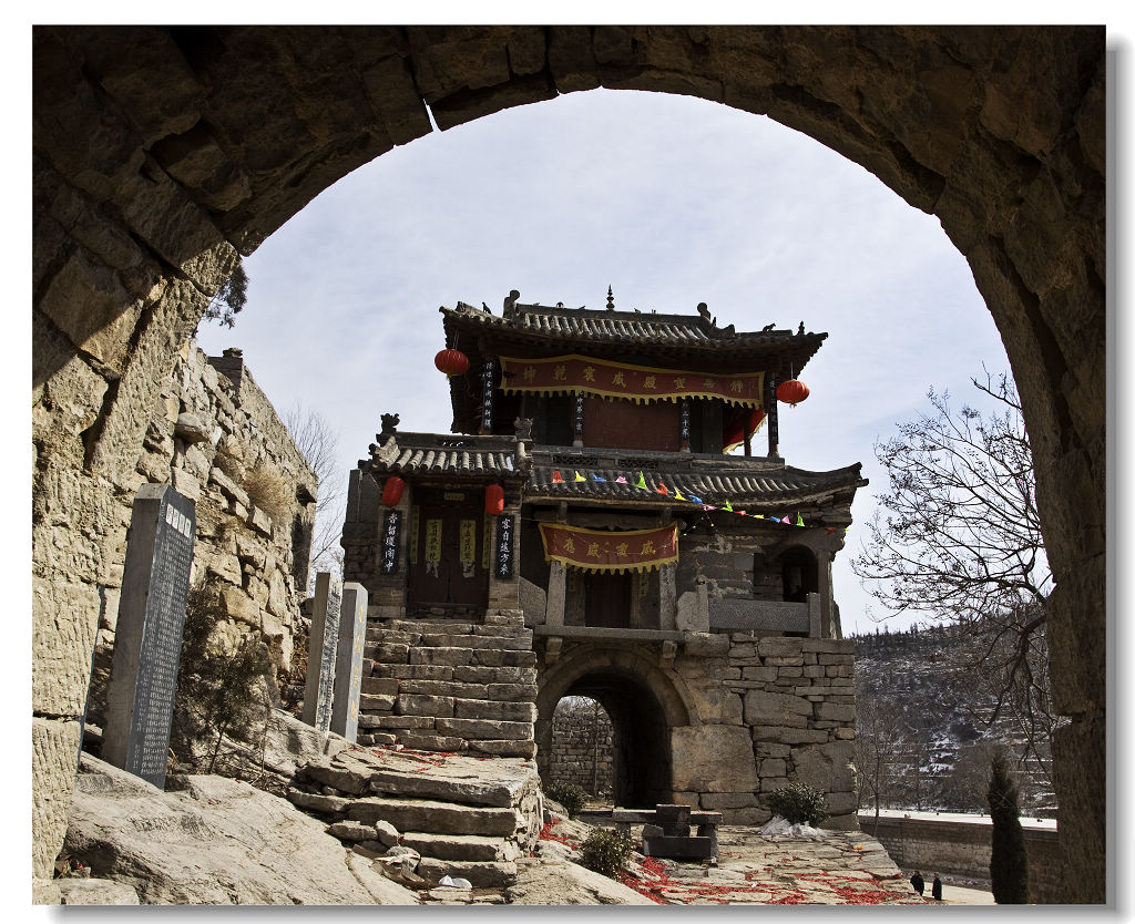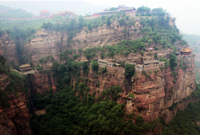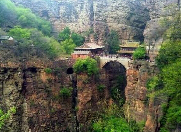 一絕“橋樓殿”。橋凌駕于百仞峭壁之間,仰視藍(lán)天一線,俯首萬(wàn)丈深淵。形制如同趙州橋敞肩拱式。橋上建樓,云飛樓動(dòng),樓內(nèi)建殿,殿內(nèi)三尊大佛。真是“千丈虹橋望入微,天光云彩共樓飛”,不是仙境勝似仙境,疑是天堂落塵?!,F(xiàn)為中國(guó)三大懸空寺之一。