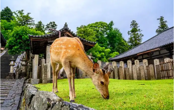 【奈良鹿公園】(約40 分鐘)奈良公園位于奈良東部、春日山腳下,占地面積為 8 平方公里。奈良人深信祖先是騎著鹿而來(lái)的,所以對(duì)鹿相當(dāng)崇敬,奈良公園內(nèi)就有 1200 多頭受市政府保護(hù)的野生梅花鹿隨意漫步,游人來(lái)到這里也能夠和 它們親密接觸。園內(nèi)到處都有售賣“鹿餅”的攤販,只要游客的手中拿有鹿餅,就會(huì)立刻被許多鹿環(huán)繞其中,感覺(jué)非常 奇特。春季嫩枝發(fā)芽櫻花綻放、秋季滿園楓葉的奈良公園都令人心曠神怡,而在其他季節(jié)也很適合悠閑自在地漫步。