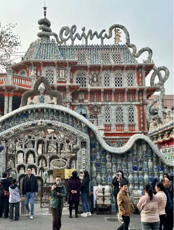 由635個民國和晚清時期的古瓷瓶壘砌串聯(lián)而成,“平”取諧音“瓶”而來,寓意平平安安,院墻呈波浪形曲線,契合瓷房子中西合璧的設(shè)計思想。