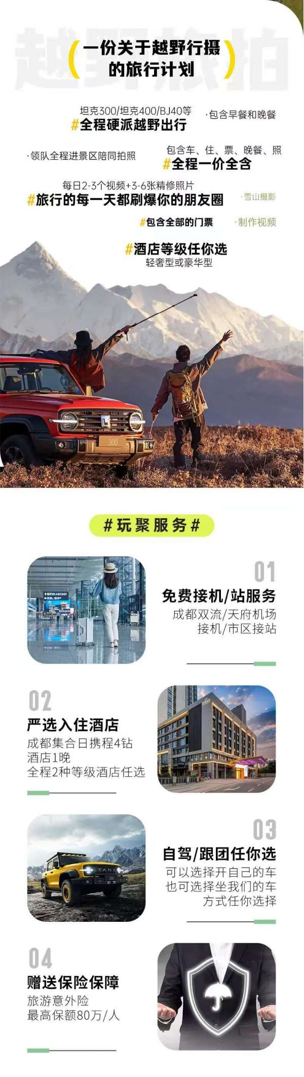 全程安排硬派越野車,車型不指定保證安排越野越野車出行,保證每人一正座;