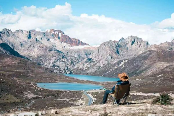 離開(kāi)措普溝,途徑海子山姊妹湖。姊妹湖由兩個(gè)相連的湖泊組成,湖水湛藍(lán)清澈,宛如兩顆璀璨的明珠鑲嵌在雪山腳下。站在觀景臺(tái)上,可俯瞰到姊妹湖的全貌,周圍是連綿的雪山和廣袤的草原,景色壯美。在此拍照留念,記錄下這令人震撼的美景。