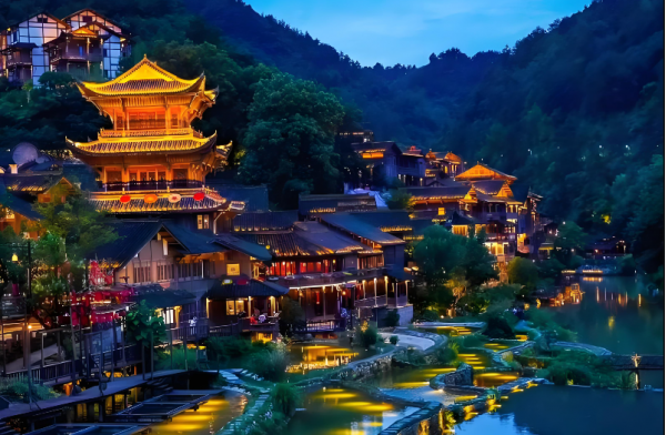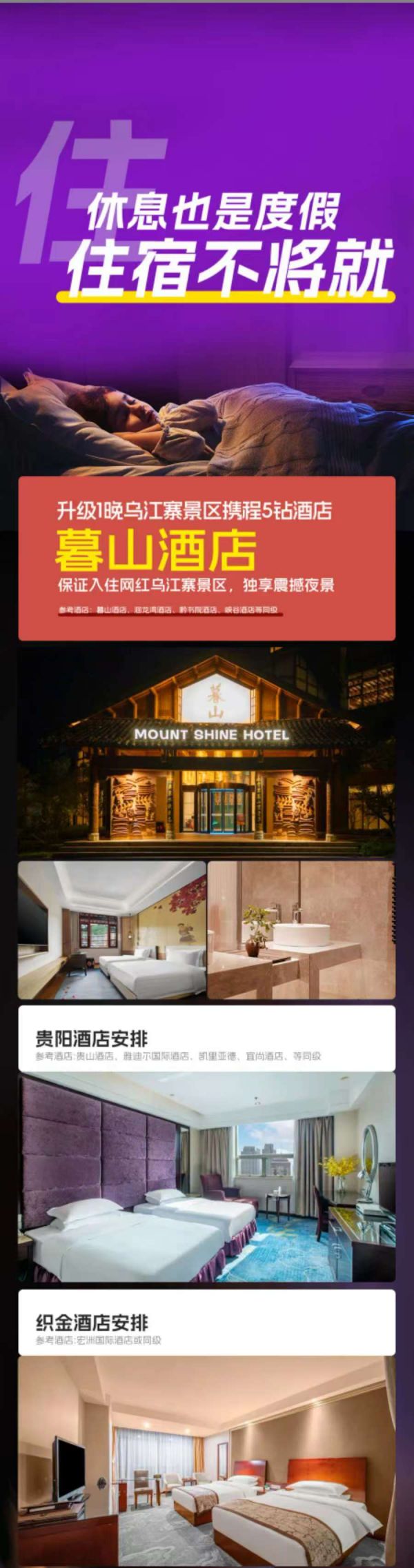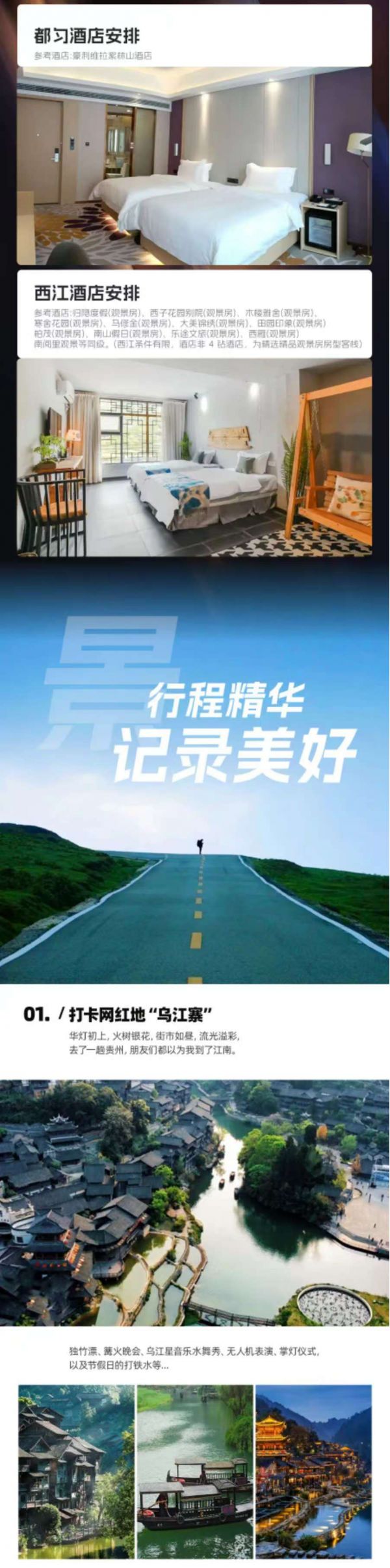 下午:午餐后乘車前往【烏江寨】國際旅游度假區(qū),車程約2.5H(景區(qū)電瓶車已包含,不限次數(shù)乘坐),江南千條水,云貴萬重山,一灣烏江碧水飄落在山間,如黛青山擁簇著烏江寨,兩岸吊腳樓錯落有致,滿滿的黔北風情,宛若治愈力拉滿的世外桃源,青山、綠水、吊腳樓、青磚黛瓦、民居、民俗、水舞秀...描繪出一幅黔北民居群落的壯美畫卷,在太乙閣碼頭坐上一艘搖櫓船,穿行在氤氳水汽之間,鱗次櫛比的吊腳樓撲面而來,斜倚船頭,坐看云煙升騰,晨光下的美景猶如一幅水墨畫在眼前暈染開來。景區(qū)是集觀光、休閑、度假、康養(yǎng)、會展為一體的大型綜合業(yè)態(tài)的旅游目的地。景區(qū)內辦理入住酒店后自由游覽,晚上景區(qū)內可以欣賞震撼壯觀的水舞秀、燈光秀、獨竹飄,無人機編隊表演等。