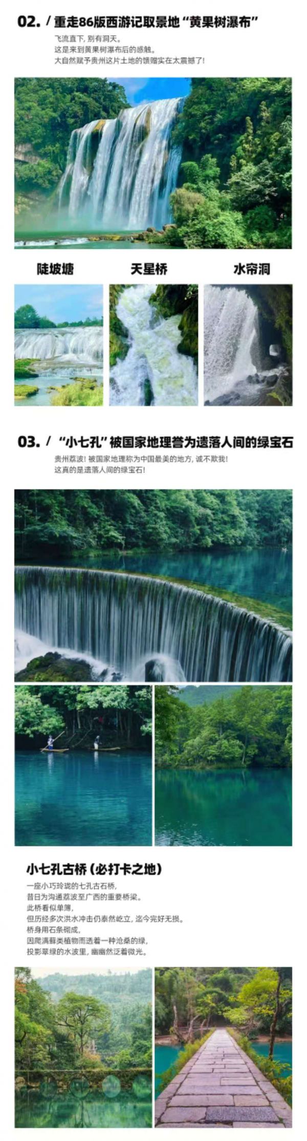 3、門票:黃果樹門票及電瓶車、織金洞門票及電瓶車(花期百里杜鵑門票及金坡/普底電瓶車)、烏江寨門票及電瓶車、灑金谷門票、西江門票及電瓶車、小七孔門票及電瓶車、紅飄帶門票
