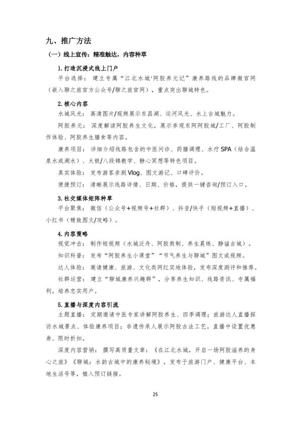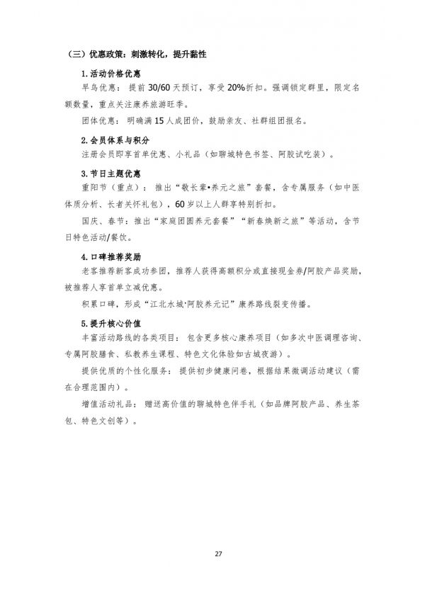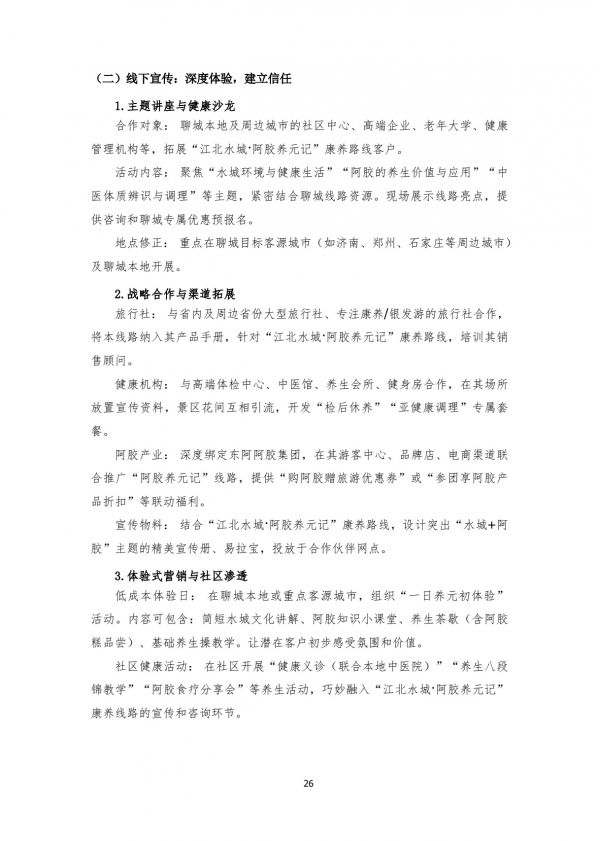 旅行社:與省內(nèi)及周邊省份大型旅行社、專注康養(yǎng)/銀發(fā)游的旅行社合作,將本線路納入其產(chǎn)品手冊,針對“江北水城·阿膠養(yǎng)元記”康養(yǎng)路線,培訓(xùn)其銷售顧問。