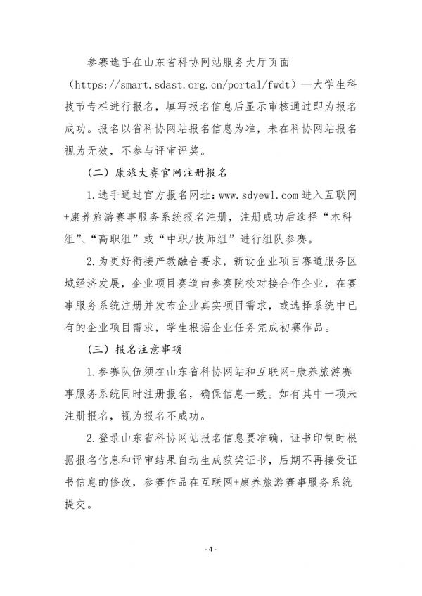 1.參賽隊伍須在山東省科協(xié)網(wǎng)站和互聯(lián)網(wǎng)+康養(yǎng)旅游賽事服務(wù)系統(tǒng)同時注冊報名,確保信息一致。如有其中一項未注冊報名,視為報名不成功。