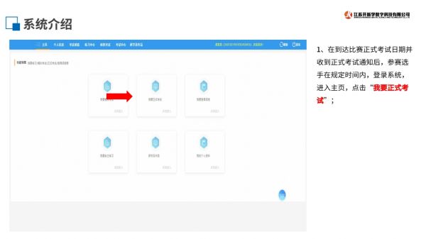 4.到理論考試日期并收到通知后,參賽選手在規(guī)定時間內(nèi)登陸系統(tǒng)-進入主頁-點擊“我要正式考試”-選擇要參與的考試名稱-點擊“進入考場”并確認考試。