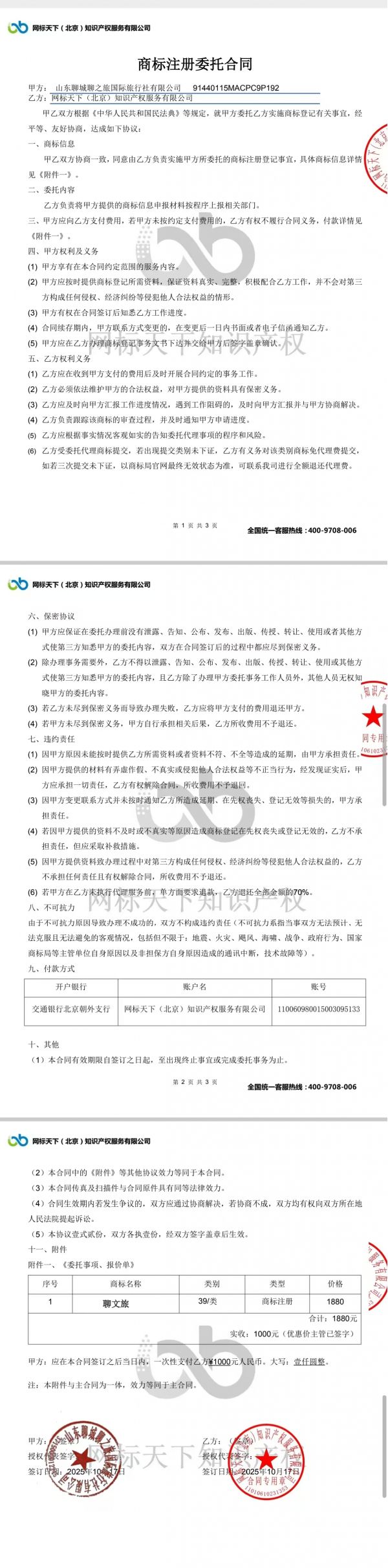 2025年10月22日山東聊城聊之旅國際旅行社有限公司委托網(wǎng)標天下(北京)知識產(chǎn)權服務有限公司代理中文“聊文旅”商標事宜。