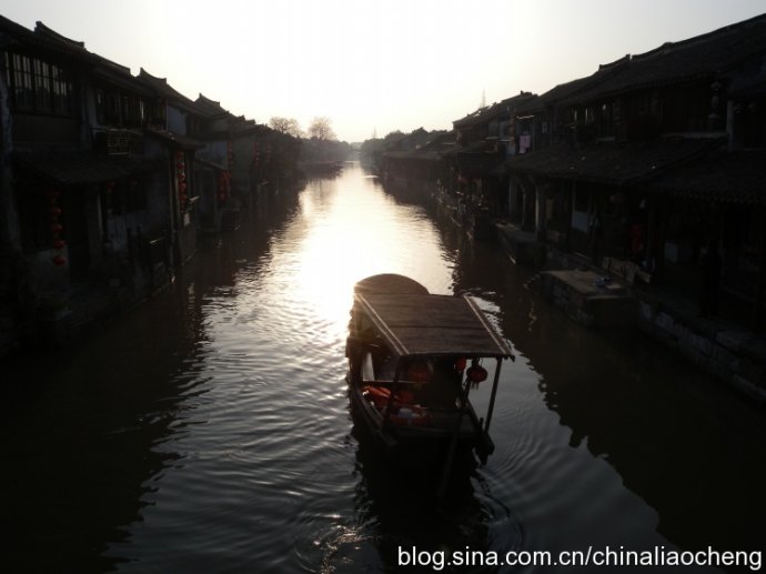 站在橋上遠眺,西塘的水、路、棚廊以及模糊的黛瓦粉墻在斜陽的暈染下,如淡彩的宣紙畫;古鎮(zhèn)彎彎曲曲的弄堂,平平仄仄的石板,瘦瘦清清的小河,高高低低的石橋,如泛黃的照片在記憶里層層清晰。這樣遠遠近近的望著,目光沾染了水的痕跡,醉成濕漉漉的癡情。夕陽斜下,橋下嫣紅的水面隨櫓的搖晃灑下一串串晶瑩剔透般的珍珠,小船兒蕩蕩悠悠地劃著,橋的影子在細細碎碎的水聲中被一波一波的漣漪輕柔地化開,亦真亦幻而又忽明忽暗,仿佛歲月的印痕在自然的畫面中流動,樹影、船影、橋影,晃動著,漸漸隱去。