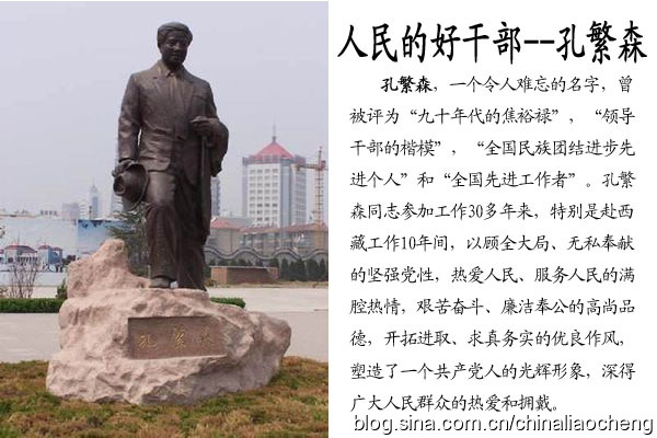 孔繁森同志參加工作30多年來,特別是赴西藏工作10年間,以顧全大局、無私奉獻的堅強黨性,熱愛人民、服務(wù)人民的滿腔熱情,艱苦奮斗、廉潔奉公的高尚品德,開拓進取、求真務(wù)實的優(yōu)良作風(fēng),塑造了一個共產(chǎn)黨人的光輝形象,深得廣大人民群眾的熱愛和擁戴。然而,天有不測風(fēng)云,人有旦夕禍福,1994年11月29日,孔繁森同志在赴新疆塔城地區(qū)考察途中,被一場車禍無情地奪去了寶貴的生命??追鄙悯r血和生命譜寫了一曲富有時代精神的奮斗之歌、創(chuàng)業(yè)之歌、奉獻之歌。他的英雄事跡和崇高精神令人震撼、催人淚下、激人奮進。中央電視臺、中央人民廣播電臺、《人民日報》、《求是》雜志等數(shù)十家新聞媒體對孔繁森同志的事跡給予了特別報道。為了緬懷英靈,激勵后人,聊城人民在他的故鄉(xiāng)山東聊城興建了孔繁森同志紀(jì)念館。原中共中央總書記、國家主席、中央軍委主席江澤民,原國務(wù)院總理李鵬,原全國人大委員長喬石,原全國政協(xié)主席李瑞環(huán)分別為紀(jì)念館題詞。中共中央總書記、國家主席、中央軍委主席胡錦濤同志發(fā)表署名文章《全黨都來學(xué)習(xí)孔繁森》。