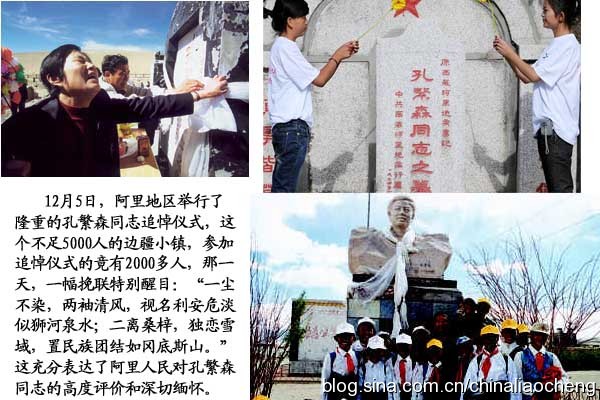 12月15日,阿里地區(qū)舉行了隆重的孔繁森同志追悼儀式,這個不足5000人的邊疆小鎮(zhèn),參加追悼儀式的竟有2000多人,那一天,一幅挽聯(lián)特別醒目:“一塵不染,兩袖清風(fēng),視名利安危淡似獅河泉水;二離桑梓,獨戀雪域,置民族團結(jié)如岡底斯山。”這充分表達(dá)了阿里人民對孔繁森同志的高度評價和深切緬懷。