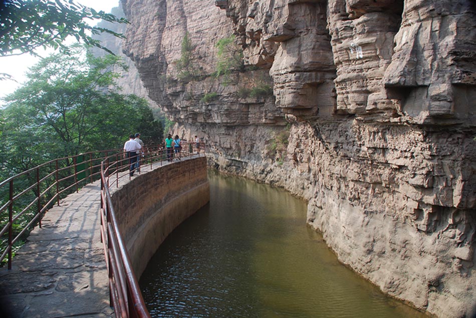 紅旗渠以濁漳河為源。渠首位于山西省平順縣石城鎮(zhèn)侯壁斷下??偢汕L(zhǎng)70.6公里,渠底寬8米,渠墻高4.3米,縱坡為1/8000,設(shè)計(jì)加大流量23秒立方米,全部開(kāi)鑿在峰巒迭嶂的太行山腰,工程艱險(xiǎn)。
