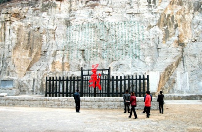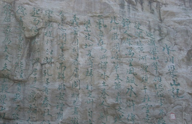 《水泊梁山記》是著名書畫大師范曾2002年專為水泊梁山風(fēng)景區(qū)撰寫。先生懷著對(duì)英雄故里的一腔深情,慷慨揮毫、步其先人范仲淹《岳陽樓記》韻,全文368字,描述了水泊梁山河岳闊峻、草木蕭森的雄奇景象?!端戳荷接洝反笮湍ρ率蹋ǜ?米、長(zhǎng)14米,距地面10余米,單字最大55厘米見方,最小字30厘米見方,通篇368字占地近100平方米,氣勢(shì)恢弘、蔚為大觀,形成了南有《岳陽樓記》、北有《水泊梁山記》的文化格局。為旅游勝地水泊梁山再添景觀,現(xiàn)為水泊梁山風(fēng)景區(qū)的主要景點(diǎn)之一。與梁山粗獷豪放的山體及周圍環(huán)境交融,深化了景區(qū)的水滸文化內(nèi)涵,成為進(jìn)入梁山風(fēng)景區(qū)山寨景區(qū)的標(biāo)志性景觀,其所在廣場(chǎng),亦成為在梁山舉行的與水滸、旅游有關(guān)的大型集會(huì)的場(chǎng)所之一。