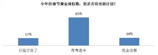 距2015年春節(jié)黃金周假期只有1個多月了,調查顯示,有出行意愿的網(wǎng)民達到八成。17%的網(wǎng)民已經(jīng)訂好了出游計劃,65%的網(wǎng)民仍在考慮中。18%的客戶表示沒有出游計劃。