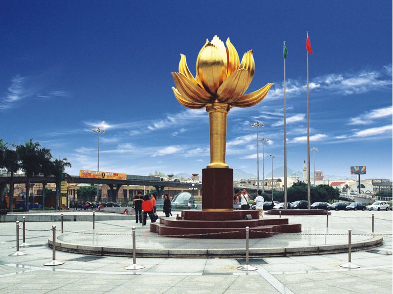 金蓮花廣場位于澳門新口岸高美士街、畢士達大馬路及友誼大馬路之間。為慶祝1999年澳門主權(quán)移交,中華人民共和國中央人民政府致送了一尊名為《盛世蓮花》的雕塑。分別大、小各一件:置于廣場上的大型雕塑重6.5噸,高6米,花體部分最大直徑3.6米;小型雕塑直徑1米,高0.9米,于澳門回歸紀念館展出。