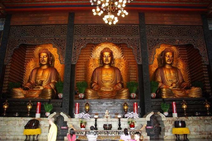大接引寺的后面是佛光山寺廟建筑群。大雄寶殿居于各殿中間,殿內(nèi)塑有高約7米的三尊大佛像,中為娑婆世界教主迦牟尼佛,右為西方極樂(lè)世界教主阿彌陀佛,左為東方琉璃世界教主藥師佛,均為盤(pán)膝坐蓮金身。大殿四壁上建有14600個(gè)佛龕,各龕均供奉一尊小佛像,佛前裝小燈,殿內(nèi)14600個(gè)長(zhǎng)明燈映著一尊大佛,版權(quán)所有,山東聊城聊之旅國(guó)際旅行社有限公司,轉(zhuǎn)載必究!金碧輝煌,其氣派令全臺(tái)所有佛寺殿堂都望塵莫及。位于大雄寶殿右面的是大悲殿,高20米,殿中供奉一尊高約7米、呈立姿手持凈瓶的觀音菩薩,殿堂四壁建有1萬(wàn)個(gè)神龕,供奉1萬(wàn)尊小觀音神像。滿殿盡是大慈大悲的觀音菩薩,故殿名又叫“萬(wàn)佛大悲殿”。與大悲殿相對(duì)屹立的為大智殿,殿中供奉文殊菩薩,據(jù)傳他曾為眾生說(shuō)法,故有“大智”之稱(chēng)。佛光山還有“佛教文物陳列館”(大愿殿)和“凈土洞窯”(極樂(lè)世界)兩處“隱形式”建筑,以“凈土洞窯”為著名。所謂“凈土洞窯”即自山麓挖入山腹的地洞,右洞入,左洞出,內(nèi)里形成“冂”形地道,布有1250個(gè)佛像以及傳道講經(jīng)等場(chǎng)景,洞壁塑繪有西方三圣等極樂(lè)世界的想象造型,在中國(guó)寺廟建筑中極為罕見(jiàn)。諸大殿建筑面積共達(dá)50多萬(wàn)平方米,風(fēng)格雖各不相同,宏偉莊嚴(yán)則一。